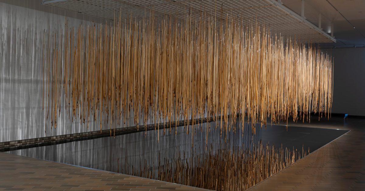 At the National Gallery of Australia, there is a spectacular installation of about 500 hand-carved wooden spears suspended from the ceiling and reflected in the panels on the floor below. It is practical and memorable, like a little oasis for contemplation. As you leave the noise of the gallery and enter this separate room, these rattling spears in their own dedicated space form an effective zone in which to contemplate their solemn beauty and the fact that each spear is unique. Yet, collectively, they form a mass of similar objects – like a large community. We witness this cloud of spears that seems to descend from the ceiling without ever crashing to earth.
