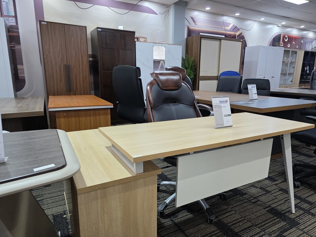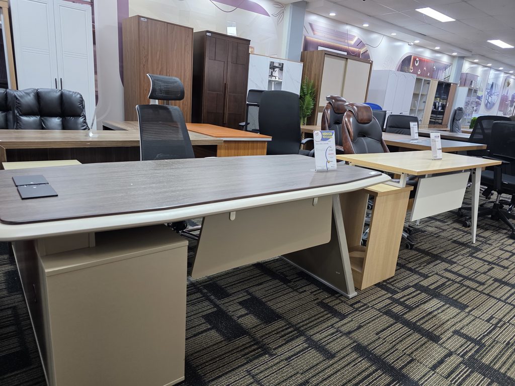 Executive desks, office tables with integrated side units, and multi-person workstations feature modern designs with clean lines and durable melamine or MDF surfaces.